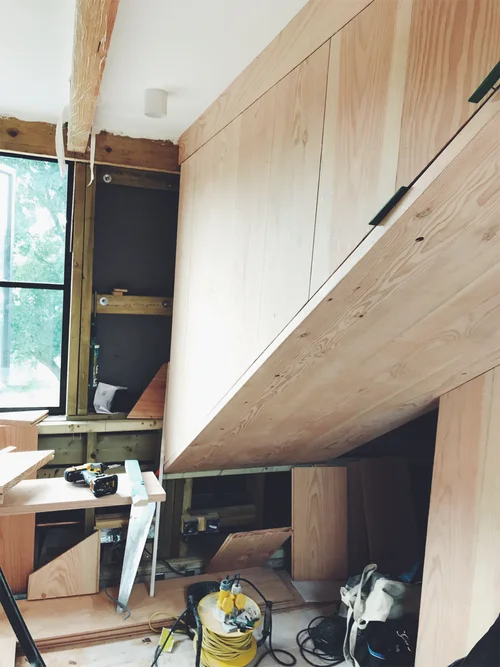 We were especially inspired by a Remodelista article on a similar refurbished house by Studio Ore. The house featured a large crittal window door frame facing the garden and a beautiful Douglas fir wall in the kitchen.