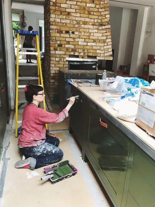 The Plain English kitchen cabinets received 200 coats of green paint, for panelling we went with light pink to keep things light.